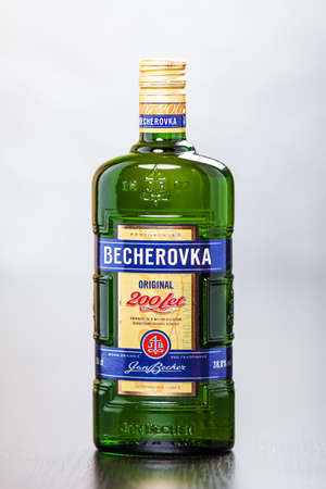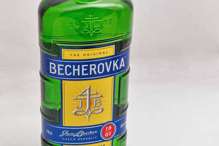 Bottle of Becherovka, a herbal bitter with gingery or cinnamony flavor, usually drunk as a digestive aid It is produced by the Jan Becher company in Karlovy Vary, Czech Republic and brand is owned by Pernod Ricard