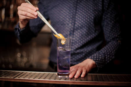 Barman decorating a glass of strong violet summer cocktail with an orange pill on the bar counter