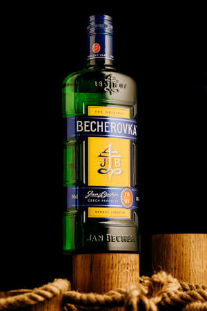 POZNAN, POL - MAY 28, 2020: Bottle of Becherovka, a herbal bitters produced in Karlovy Vary, Czech Rep. by the Jan Becher company. Owned by Pernod Ricard.