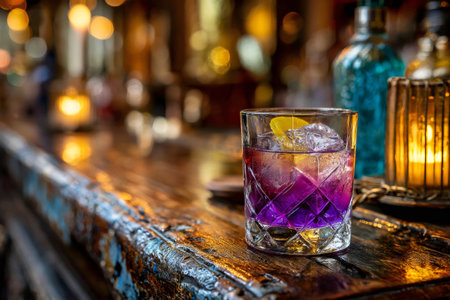 Craft cocktail with ice and lemon providing a refreshing drink on a rustic bar