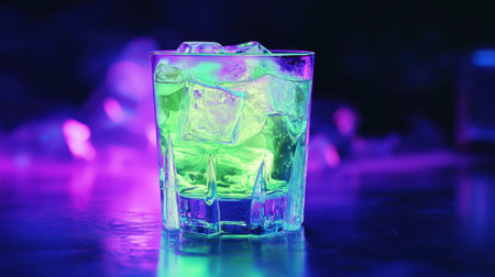 A neon green energy drink in a glass with ice, glowing under blacklight, creating a futuristic and high-energy atmosphere.