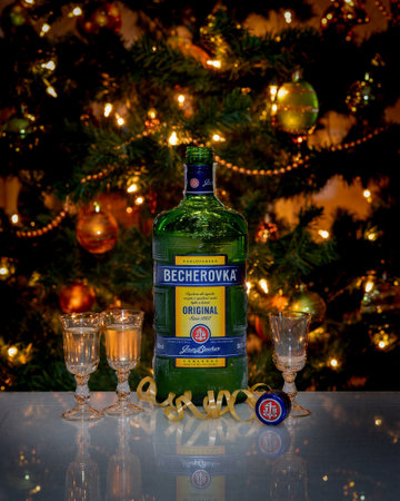 Marianske Lazne, Czech Republic - December 31, 2020: Bottle of Becherovka liquor - Czech herbal liqueur, produced in Karlovy Vary. The fortress is 38%.