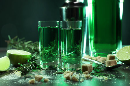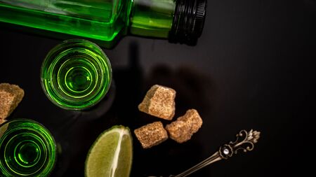 Absinthe green liquor in glasses. Alcoholic hallucinogenic beverage. Dark background. Pieces of white sugar. Copy space