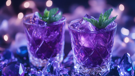 Two elegant purple cocktails with mint garnishes, surrounded by sparkling gemstones and a shimmering background, embodying the beauty of crafted mixology.