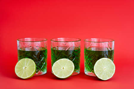 green alcohol drink in three faceted glasses with water drops and halves of limes on red