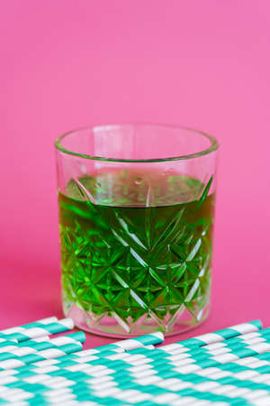 striped paper straws near faceted glass with green cocktail on pink