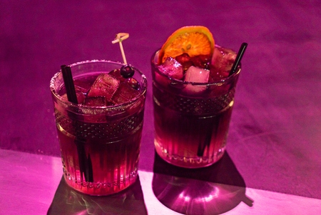 Three drinks at the party. Three shots with cocktails at the bar. Liquor, vodka, fresh. Shining on a colored background. Night club, after party.