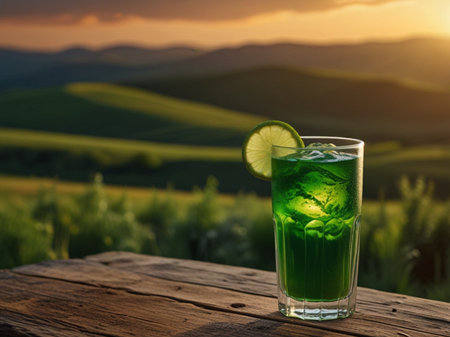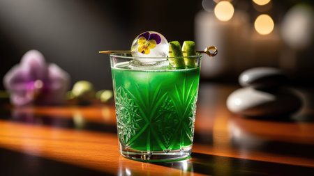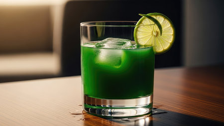 An AI generated illustration of A crystal clear shot of an emerald green beverage in a glass on a countertop