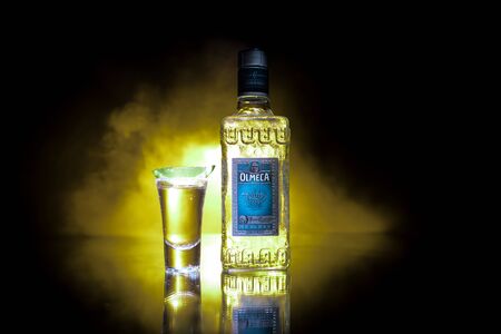 Baku, Azerbaijan - JUNE 16. 2019. Olmeca Tequila on wooden table on a dark toned foggy background. Olmeca Tequila is a tequila produced in Jalisco, Mexico. Olmeca is owned by the Pernod Ricard Group.