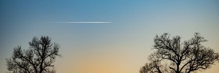 Landscape In The Evening At Sunset The Trail Of A Flying Aircraft And Silhouettes Of Trees Against The Background Of The Sky. Winter Season, February. Web Banner. Natural Background.