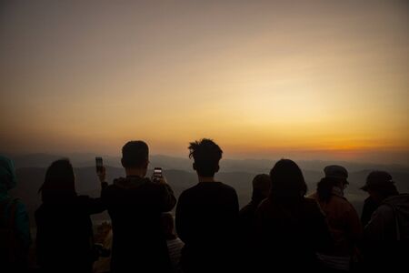 tourist standing in sun rising site and taking a photo of sun risng sky