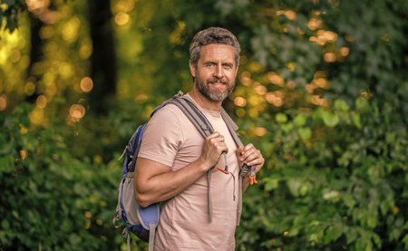 Man traveler hike with backpack. Hiker adventure. Trekking lifestyle. Man hiking in countryside. Hispanic man forest. Hiker with backpack hiking in forest. Male hiker walking in forest. Backpacking