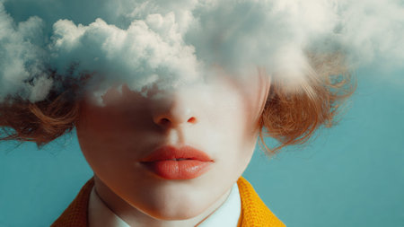 Surreal portrait of woman with cloud head in vibrant colors.