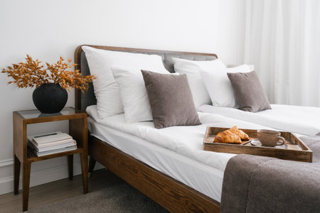 Home bedroom interior, white bed decor. Cozy room with scandinavian design, closeup at coffee table near white bed. Furniture for comfortable relaxation, apartment with wooden object.