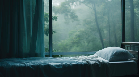 Bed with a view of a misty forest through a large window