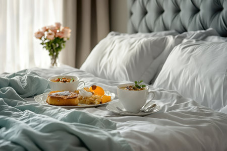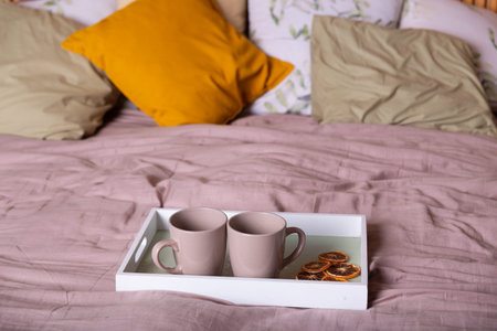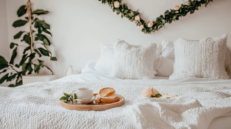 Cozy Modern Bedroom with White Bedding and Breakfast Tray Featuring Bagels and Tea - Concept of Comfort, Relaxation, Morning Routines, and Home Decor. Valentine's Day.