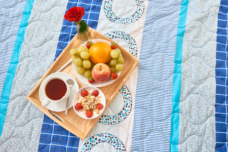 High view image of tray with fresh fruits, hot tea and porridge and flower rose in vase for breakfast for your beloved