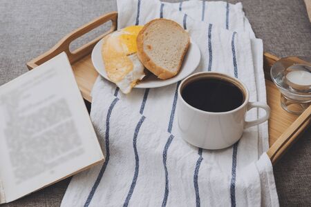 1 Cup of black coffee, a sandwich with scrambled eggs and cheese, a saucer on a towel on a tray, candle, open book