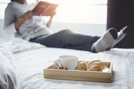 Relaxation and recreation, Young happiness woman on the bed with enjoying reading old book in holiday and morning cup of coffee and Croissant.