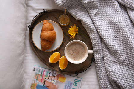 morning breakfast for one bed wooden tray coffee croissant juice apple grey linens bedding sheet pillow coverlet hotel room early morning. hotel background concept interior copy space top view