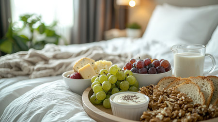 An inviting morning scene showcasing a breakfast tray with ripe grapes, creamy cheese, crusty bread, and fresh milk, set in a warm, cozy bedroom ambia