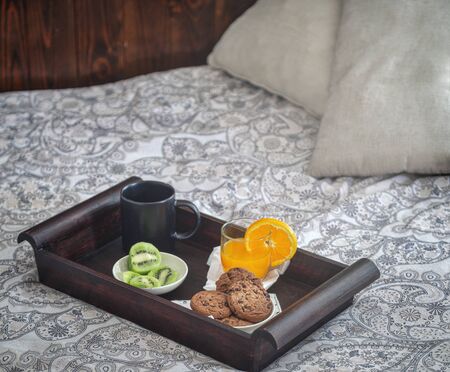Healthy breakfast on a wooden tray in bed Glass of orange juice, kiwi and cookies. Brown green and orange. White cushions.