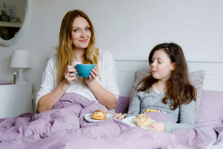 Lovely young mother and cute school kid girl cuddling together in bed in morning. Happy family of young single woman and beautiful daughter having breakfast, eating on mothers day.
