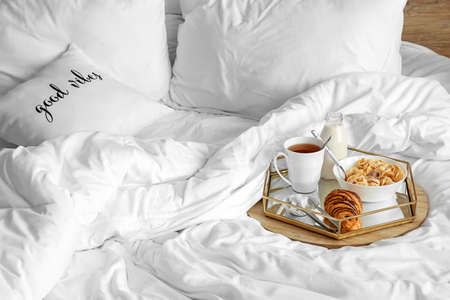 Bed breakfast. Lazy morning breakfast in wooden tray on the bed blanket with coffee. Morning breakfast still life