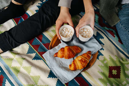 Hands holding mugs with coffee and marshmallows. Couple having a breakfast in a bed. Coffee and eating croissants. Top view.