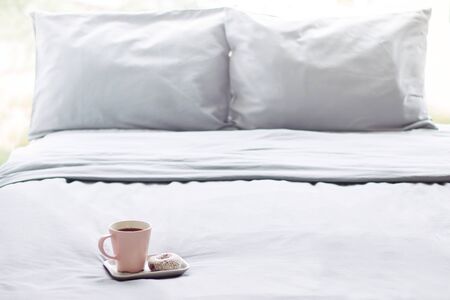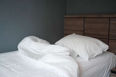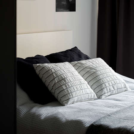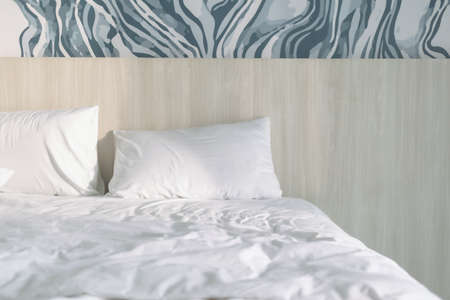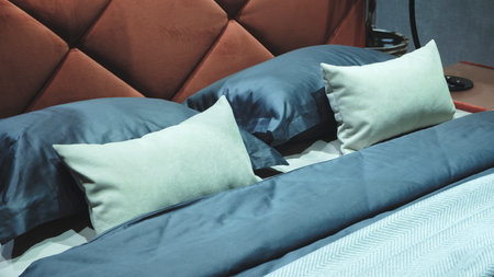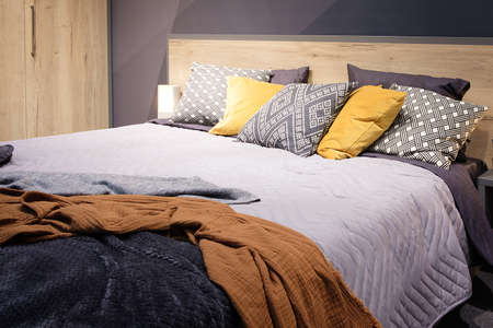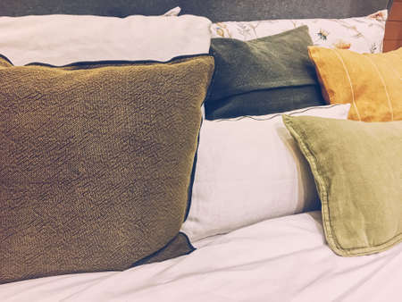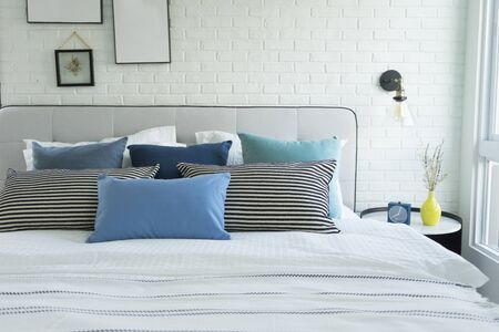 Pillows and cushions on a beautiful bed in bedroom for healthy and comfortable sleep