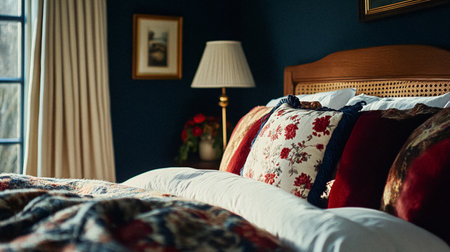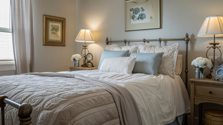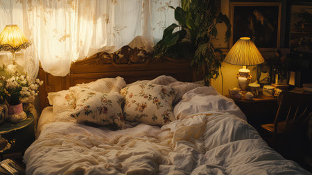 A cozy bedroom scene featuring floral pillows and soft blankets, softly lit by warm lamps and natural light, creating a serene and inviting atmosphere.