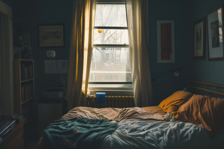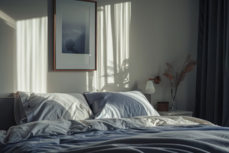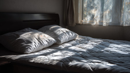 A tranquil bedroom scene featuring a neatly arranged bed with soft pillows, bathed in gentle morning light, creating a peaceful and inviting atmosphere.