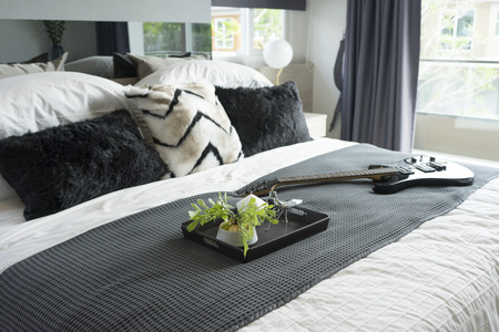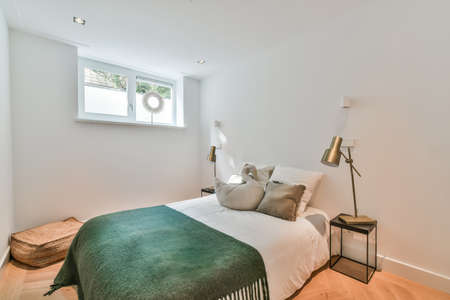 Interior of a modern bedroom in an apartment, hotel or private house with a bed and pillows