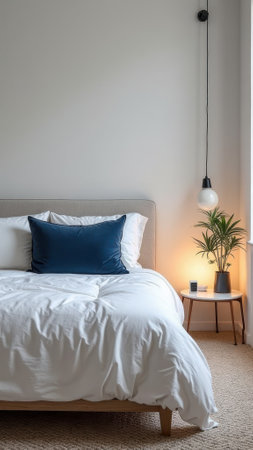 Minimalist bedroom with cozy bed, pendant light, and indoor plant for relaxation. That the image is generated using AI.
