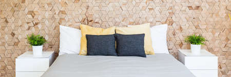 Closer shot of bedroom interior with the marital bed with cushions in three colours, small commodes and wooden wall on a bedhead
