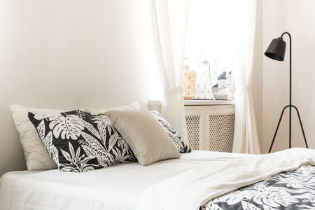 Close-up of pillows and leaf motif cover on a bed in a bright bedroom interior. Black metal lamp next to the bed. Real photo.