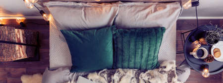 Panoramic photo of rustic bedroom interior with cozy bed and metal nightstand with plant and coffee
