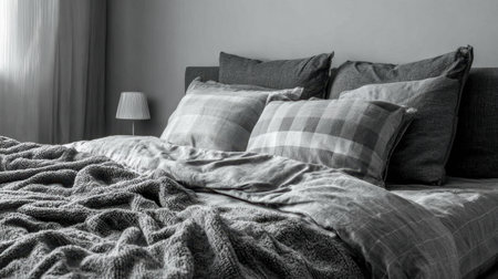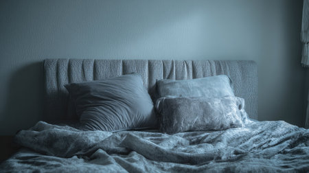 This image features a cozy bedroom with gray textiles, soft pillows, and a minimalist design. A perfect space for relaxation and home decor inspiration.
