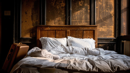 Cozy bedroom scene featuring neatly made bed with white linens and wooden headboard. suitcase rests beside bed, suggesting travel or temporary stay. warm light creates welcoming atmosphere