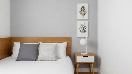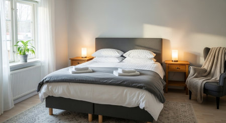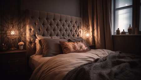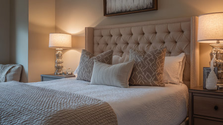A serene bedroom scene showcasing soft lighting, elegant decor, and a cozy atmosphere. Ideal for promoting comfort and stylish interior design.