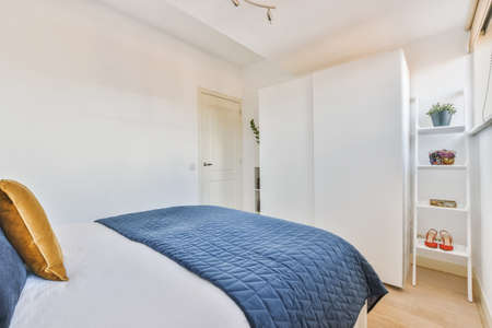 White and blue spacious bedroom with a large bed, in the Scandinavian style. Mockup and free space for text and pictures