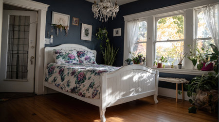 An interior shot showcases a bedroom with a white bed adorned with a floral patterned comforter and pillows. The scene is illuminated by natural light from a window, highlighting the room's white walls and wooden floor. This versatile image could be used for various commercial projects related to home decor and lifestyle.