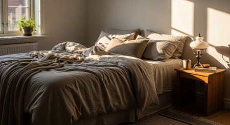 a cozy bedroom scene featuring a neatly made bed and a bedside table with a lamp in warm sunlight