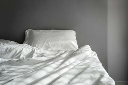 Loft bedroom with white bed in soft sunlight of winter morning.