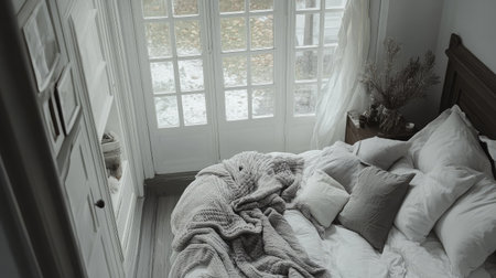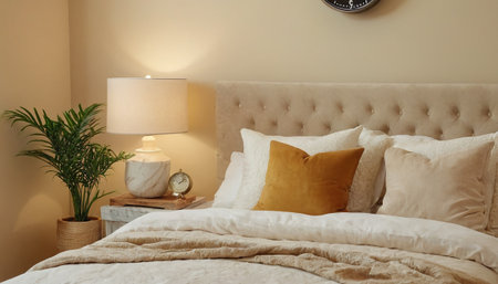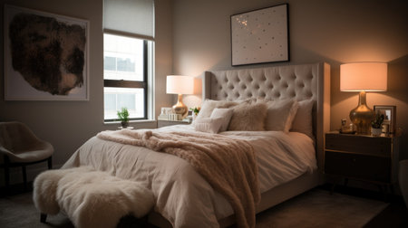 Cozy and elegant bedroom interior with luxurious textiles and warm lighting.