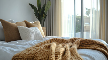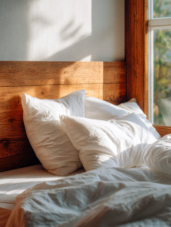 Bright morning light spills over a tranquil bedroom, illuminating a welcoming, slightly tousled bed adorned with plush pillows and gentle fabric folds.