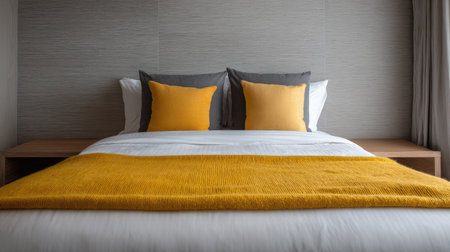 This image captures a cozy and modern bedroom featuring a soft bedspread and decorative cushions in vibrant yellow, creating a warm and inviting atmosphere perfect for relaxation.