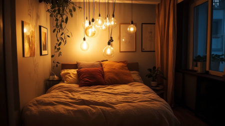This beautiful bedroom features soft lighting and stylish decor, creating a warm and inviting atmosphere. Perfect for inspiration in home styling and cozy living.