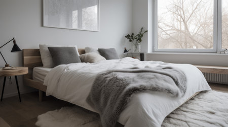 Interior design of Bedroom in Scandinavian style with Platform bed with white linens decorated with Faux fur throw, graphic pillows material. Modern architecture. Generative AI AIG24.