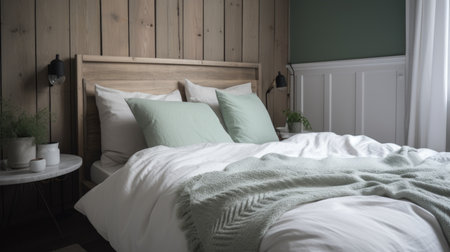 Interior design of Bedroom in Scandinavian style with Bed decorated with Knit Blanket, Wood Wall material. Modern architecture. Generative AI AIG24.